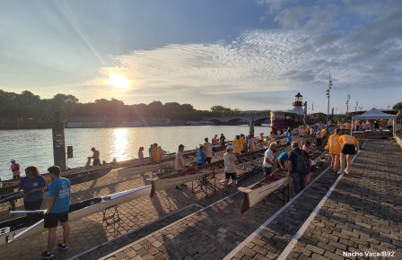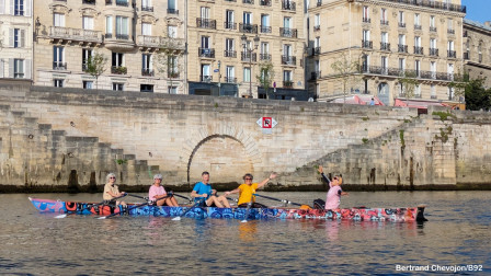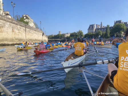 Les 21 yolettes de Boulogne 92, VSN, du CNF, Basse Seine, l'Encou et Ris-Orangis ont descendu la Seine accompagnées de kayaks, paddles et dragon boats. Le parcours : départ à 7h du quai de Bercy, arrivée à la passerelle Debilly, soit environ 7 km.